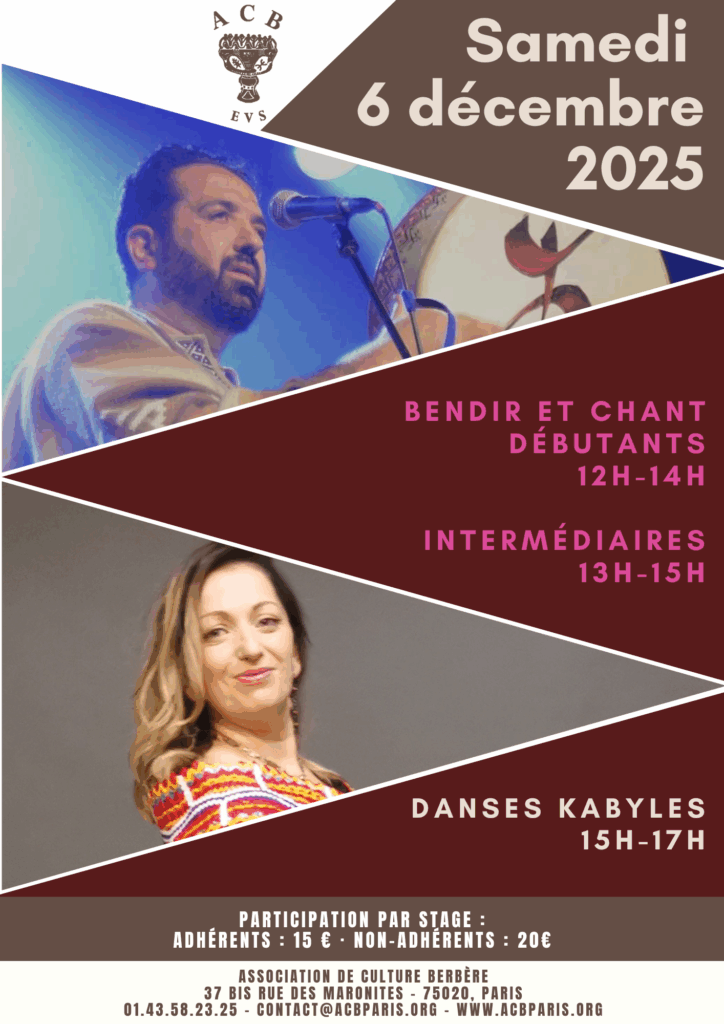 Le prochain stage de bendir et chant avec Azal Belkadi se tiendra le samedi 6 décembre 2025 entre 12h00 et 15h00 (12h-14h débutants, 13h-15h intermédiaires), tout comme celui de danses kabyles avec Nora Irsane qui sera, lui, de 15h00 à 17h00.