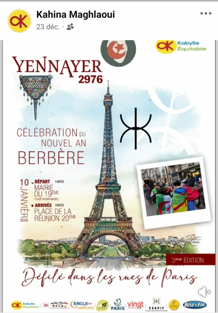 Kabylie Équitable organise un défilé dans Paris pour célébrer Yennayer « fête du partage et du vivre-ensemble » le 10 janvier. Départ devant la mairie du 19ᵉ arrondissement à partir de 14h30. ➡
